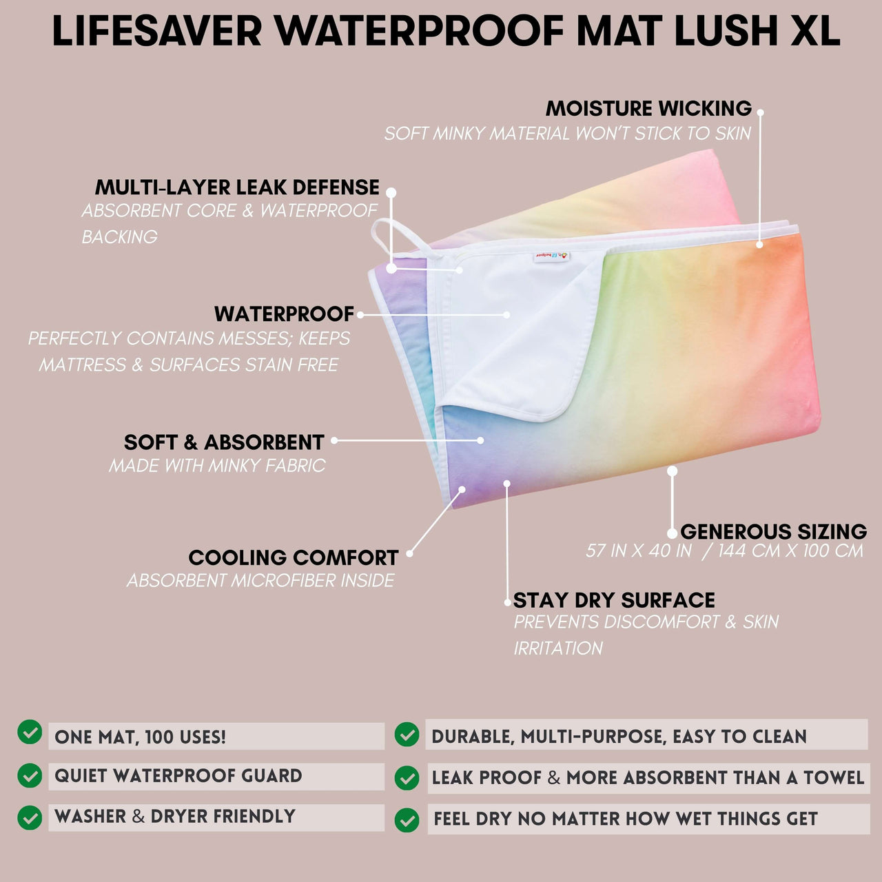 The Lifesaver Lush XL Mat measures 57" x 40" (144.78 cm x 101.6 cm), making it the perfect choice when you need generous coverage. Whether you're protecting a queen or king bed, fully covering a two-seater sofa, or spreading it out for a cozy family picnic, this mat has you covered—literally. With its soft, stay-dry minky top and reliable waterproof backing, the XL delivers both comfort and confidence in every spill-prone situation.