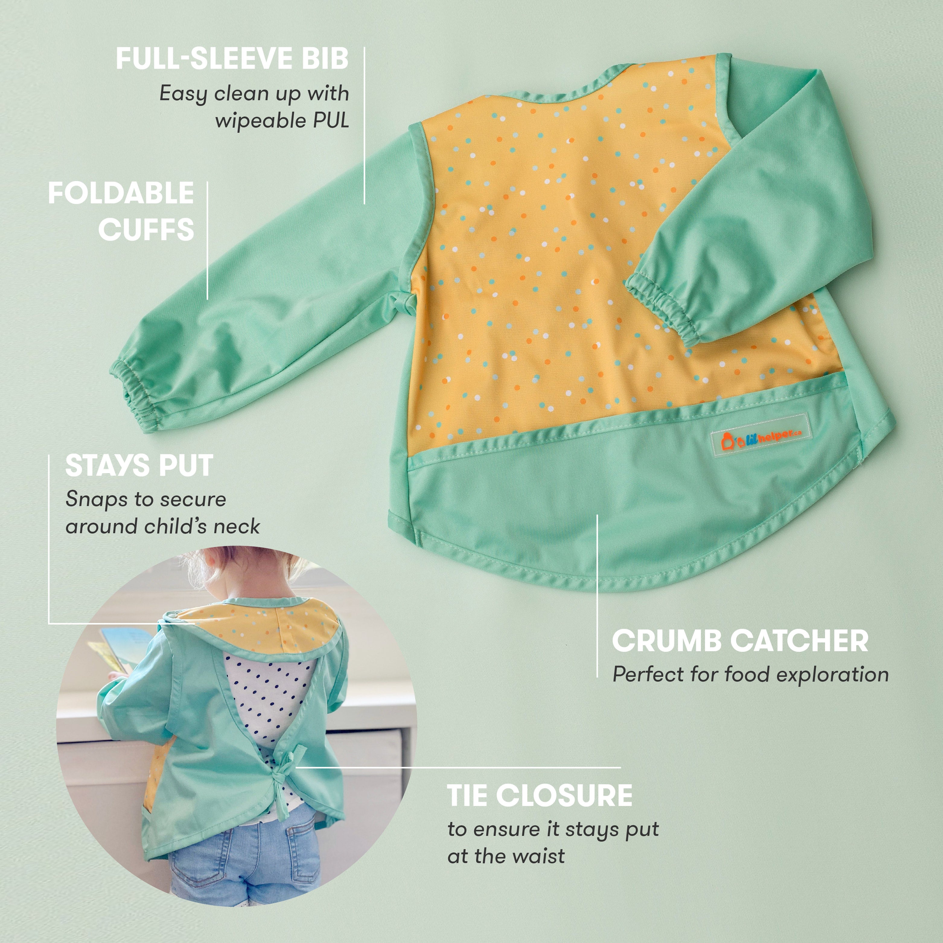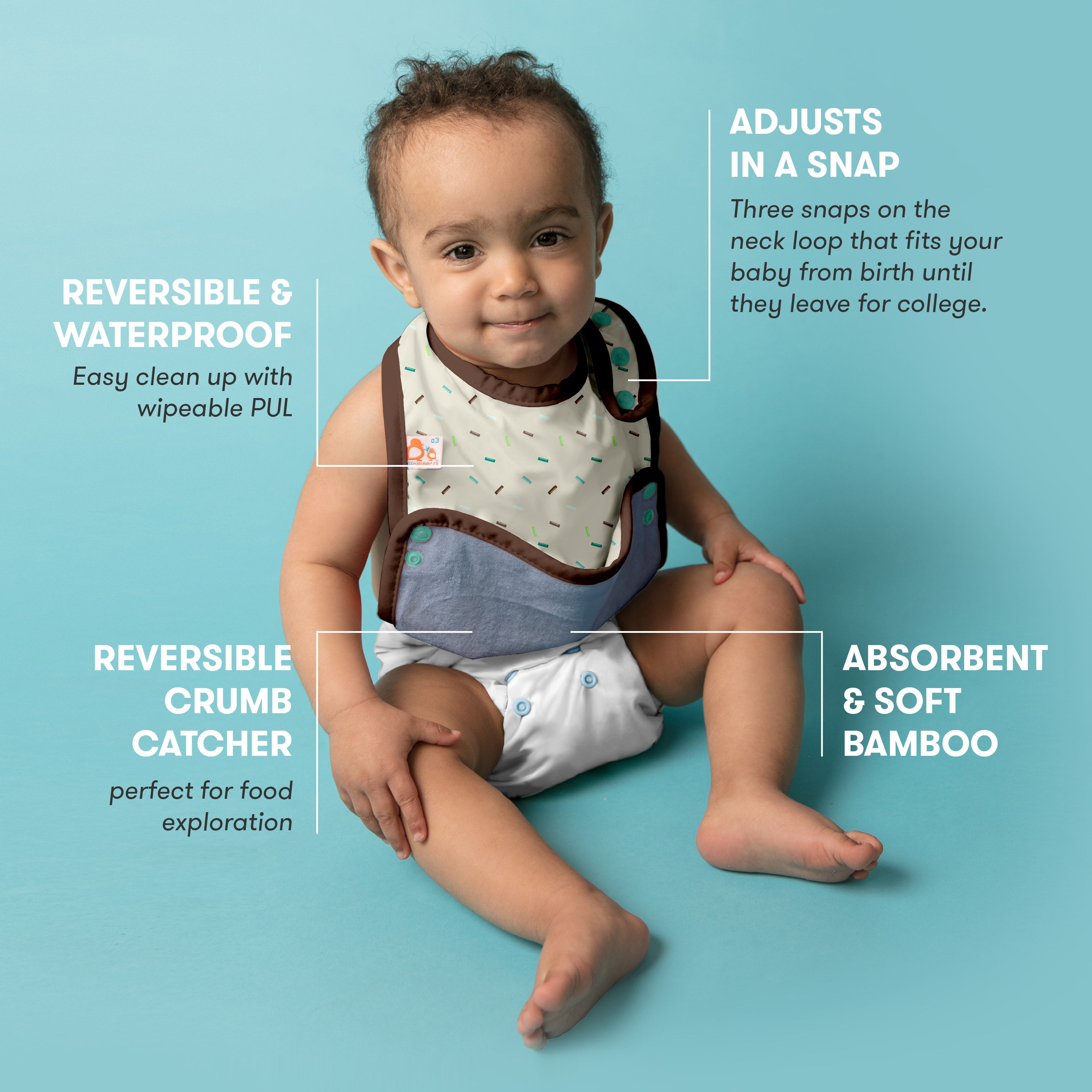When it's time for juicy watermelon, snap the bib with the absorbent bamboo side facing out to soak up any drips. Trying mashed potatoes? Flip the bib with the PUL side out, which is easy to wipe clean after mealtime. You can also snap the sides together to create a pocket for catching crumbs, or leave it hanging for full coverage.