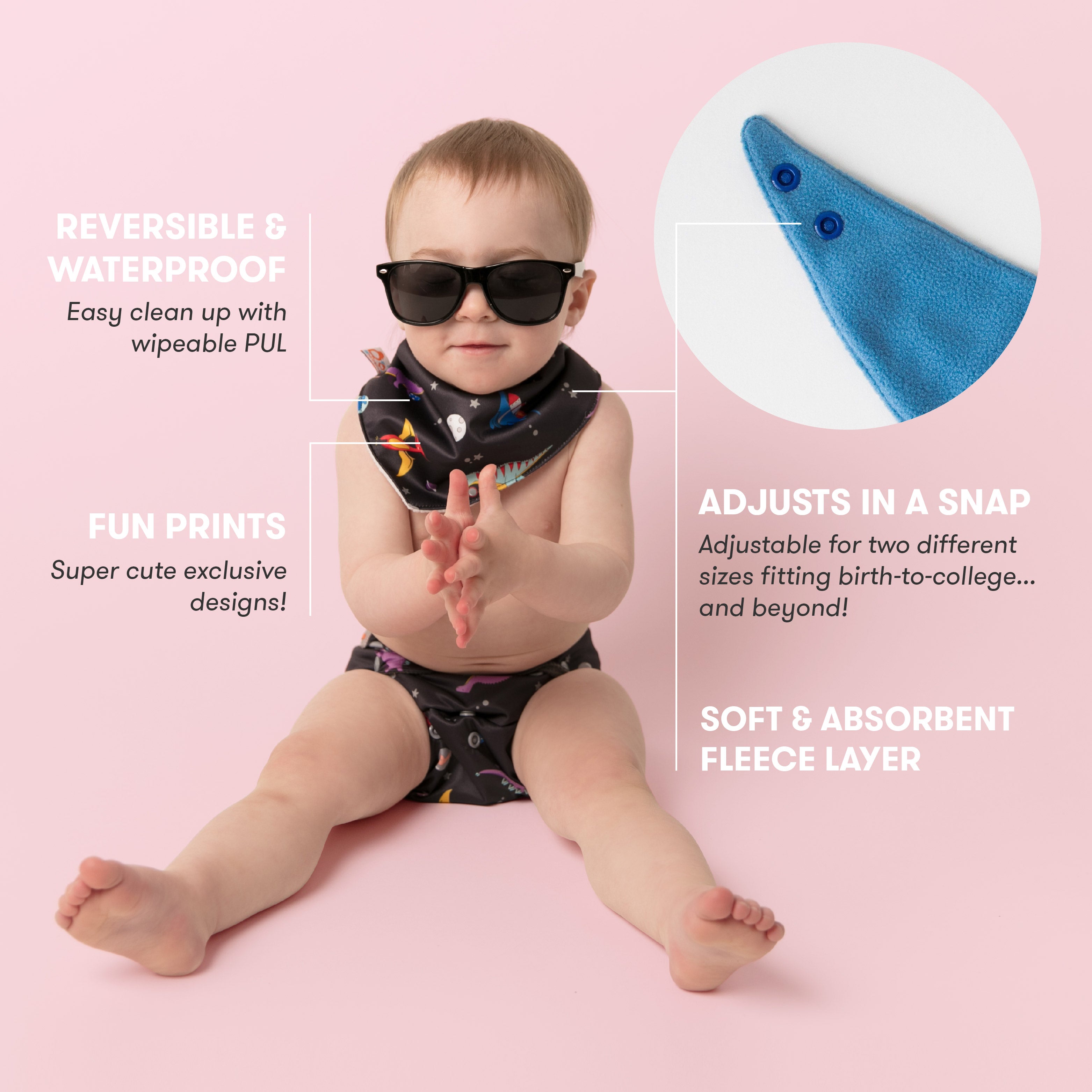 It’s simple—just flip it around! The bib snaps both ways. If your little one is teething and drooling, turn the fleece side out to absorb all that moisture. For mealtime messes, turn the PUL (print) side out to wipe away the food with ease.