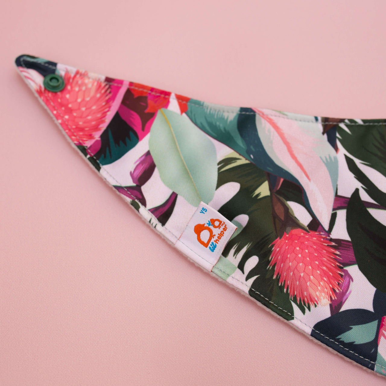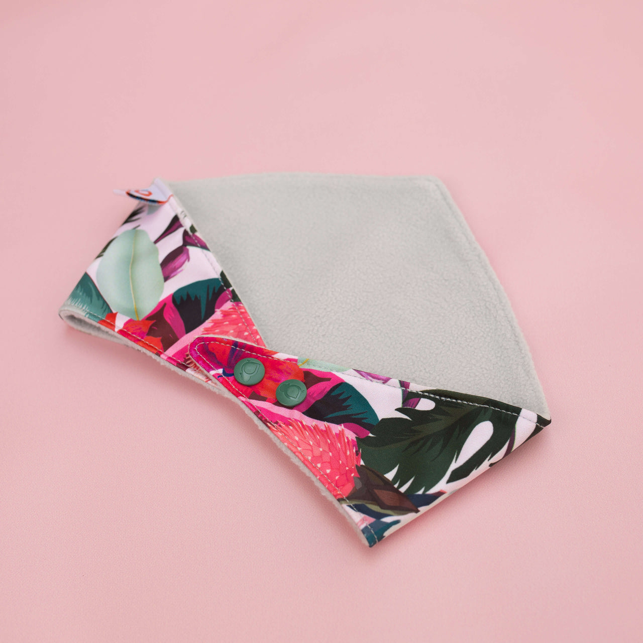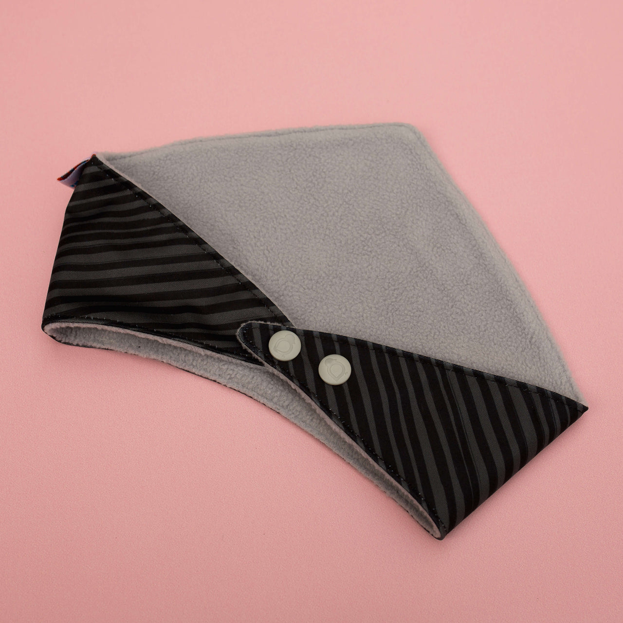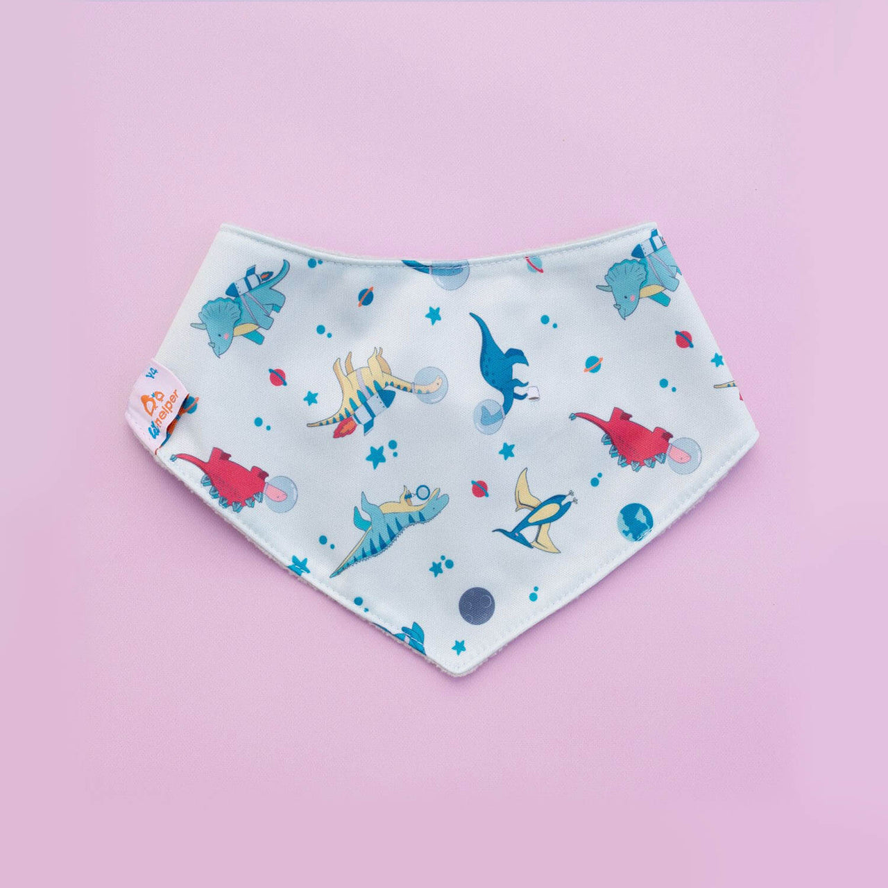 Soft fleece on one side for drool, waterproof PUL on the other for messes. Flip it, wipe it, repeat—two bibs in one stylish package.