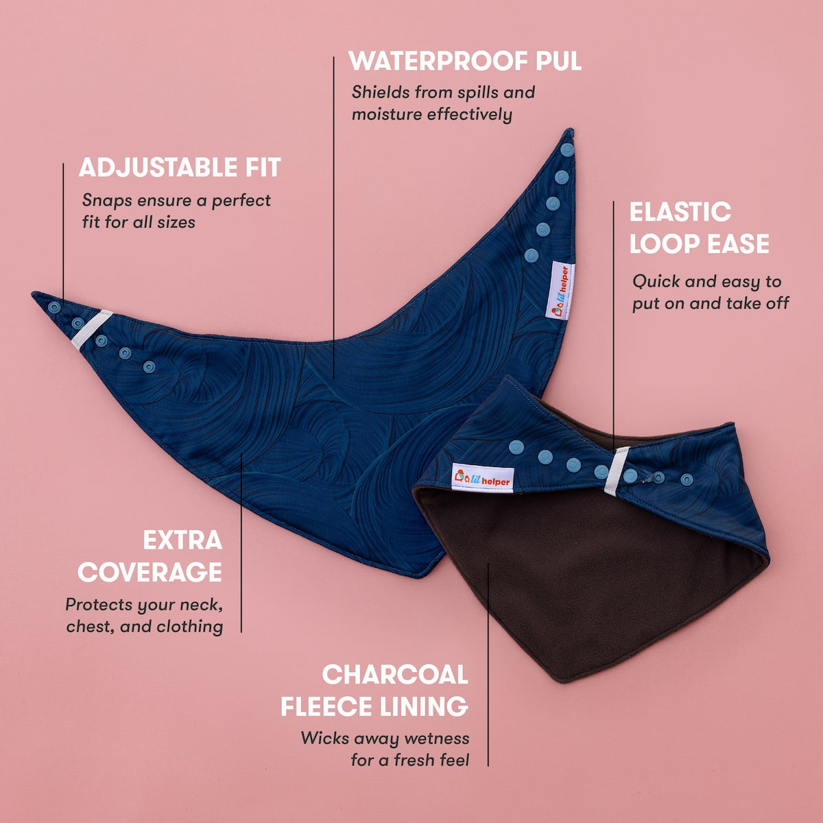 Stay dry with the Super Scarf. Reusable adult bib scarf with waterproof protection and absorbent layers, perfect for clothing protection.