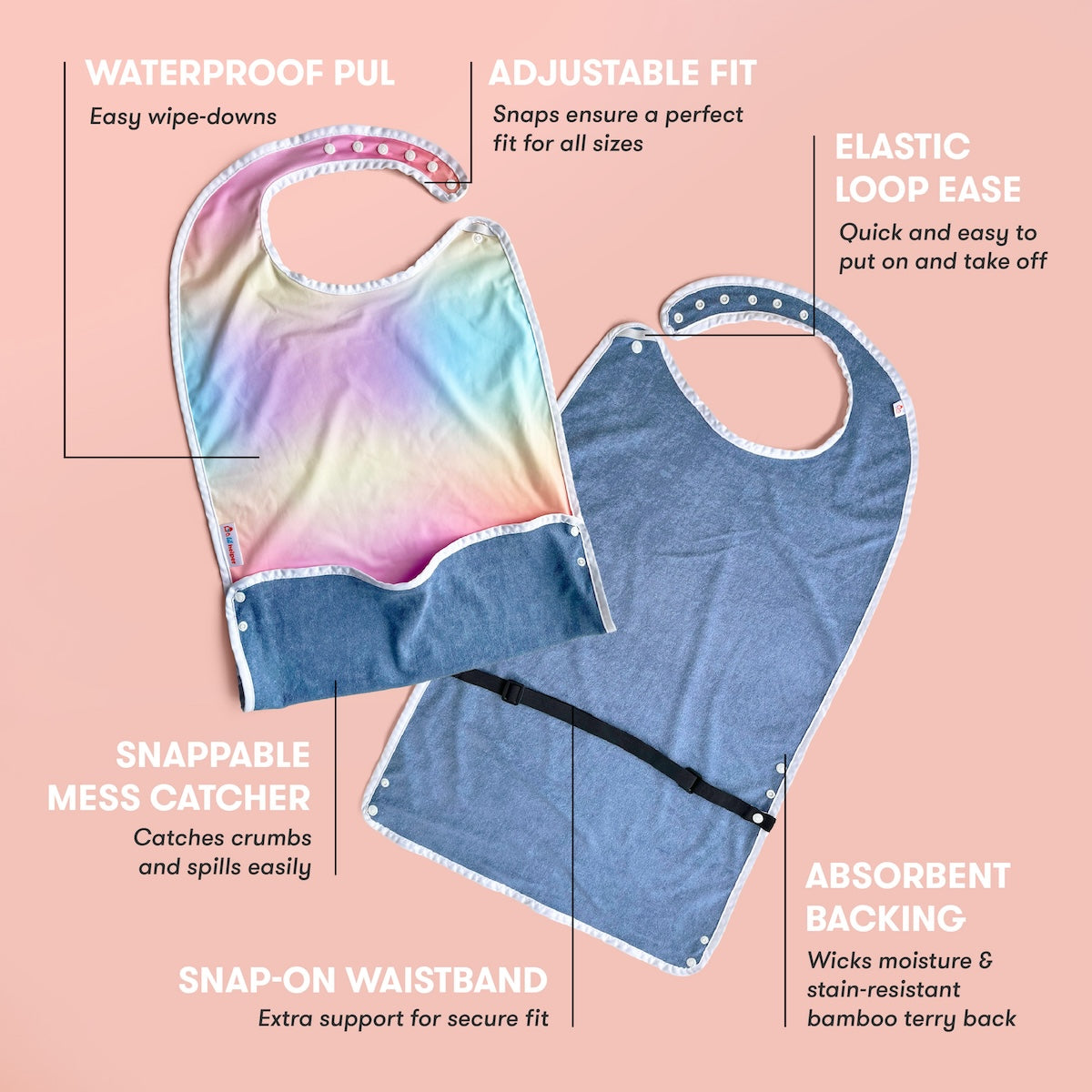 Whether it’s a full-on spaghetti splash zone or a sneaky sip gone sideways, the Super Smock and Super Scarf have your back! Designed to protect clothing while preserving comfort and dignity, these washable, reusable bibs are anything but basic.