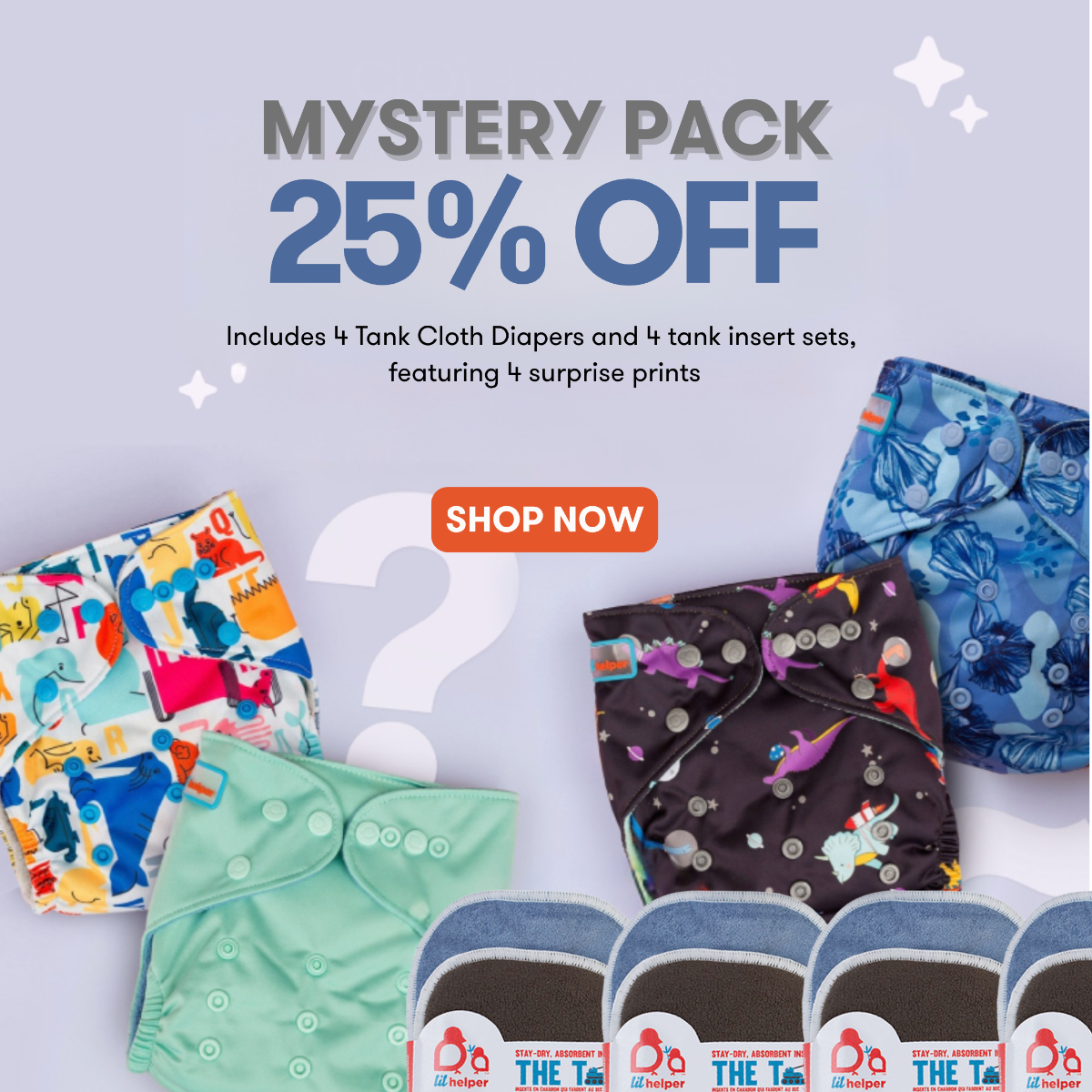 Soft, absorbent, and easy-to-use, elevate diaper changes with LilHelper's Mystery Pack (includes 4 cloth diapers and 4 tank insert sets).