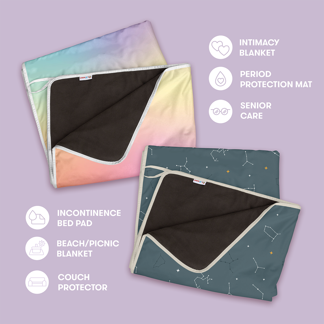 A luxuriously soft, reusable waterproof blanket with absorbent layers, ideal for periods, intimacy, senior care, nighttime security, and everyday comfort.