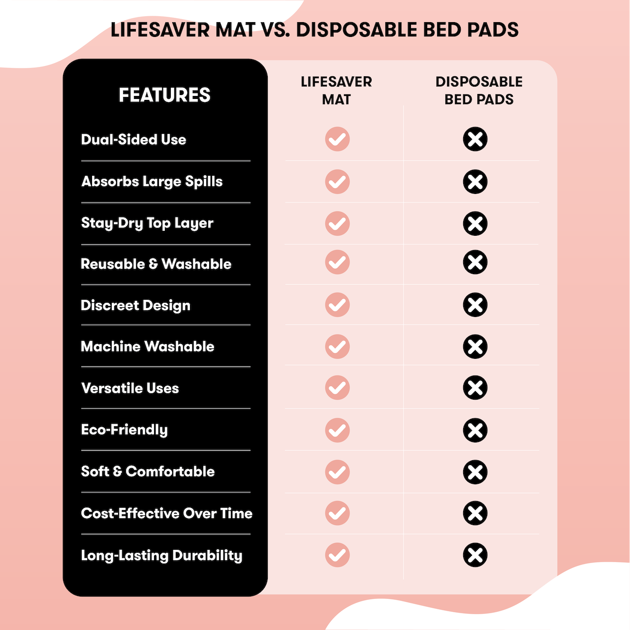 When it comes to managing spills, accidents, and everyday messes, the Lifesaver Mats outshine disposable options with its reusable, versatile, and stay-dry design. See how it compares