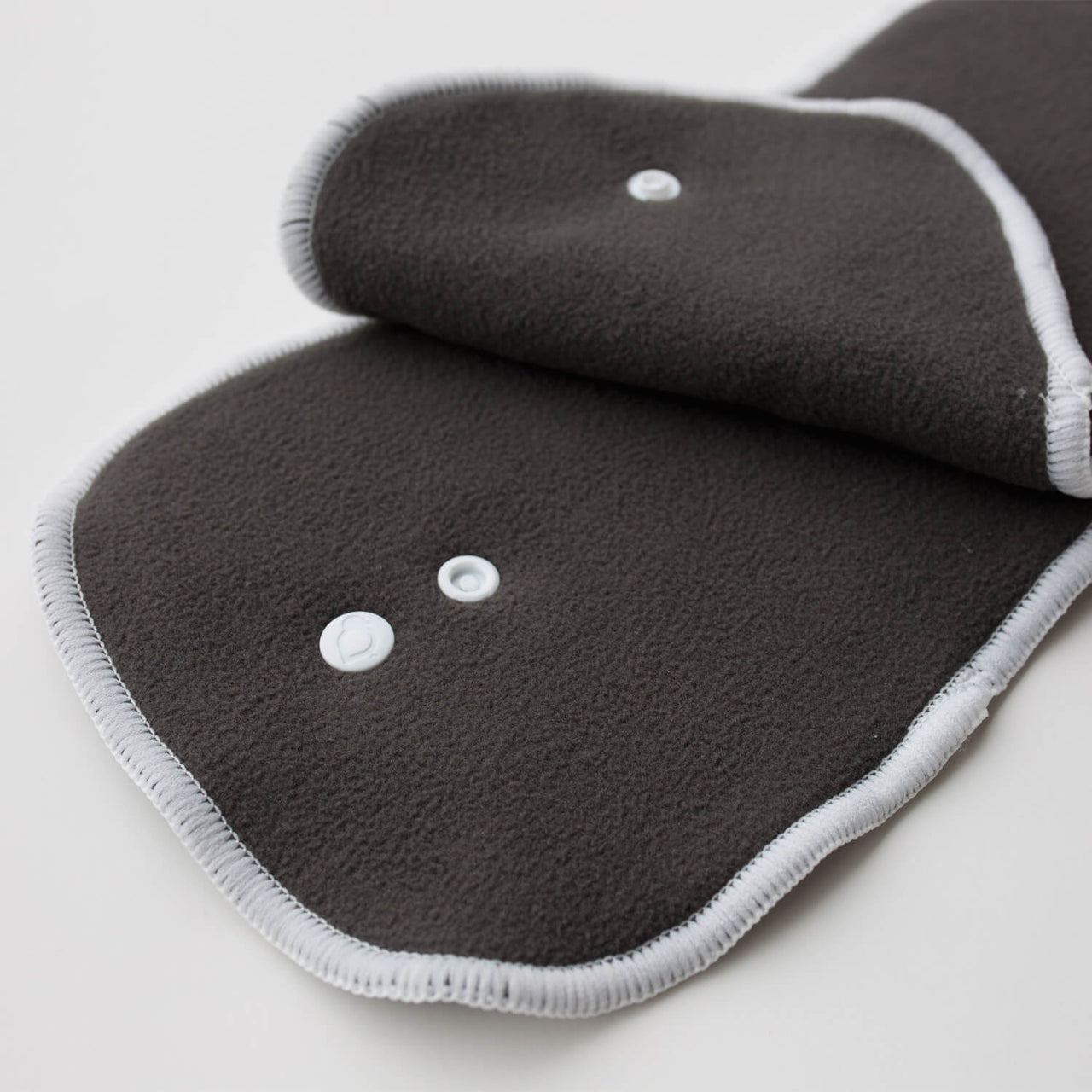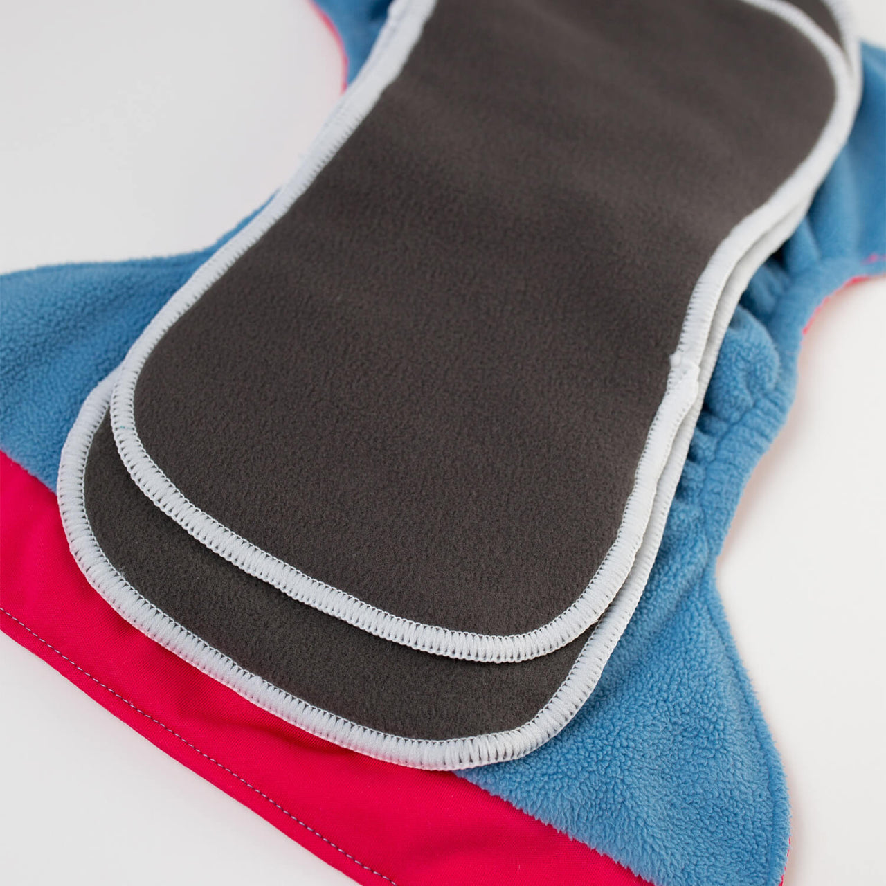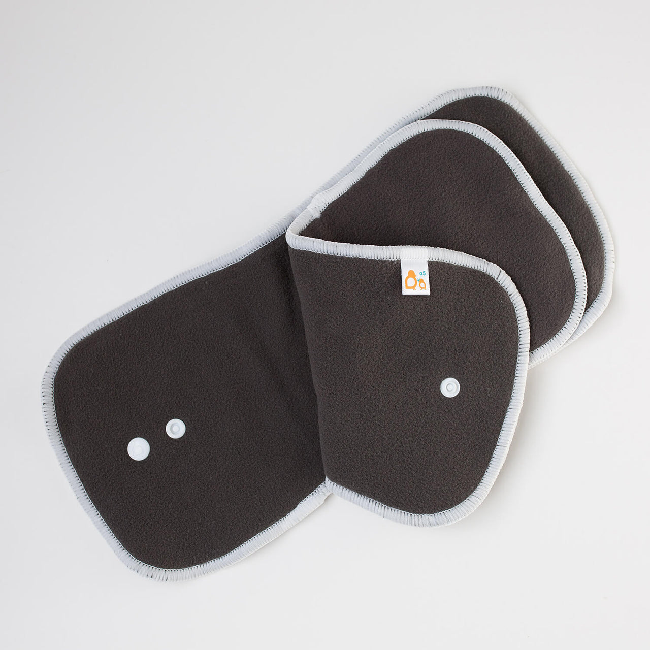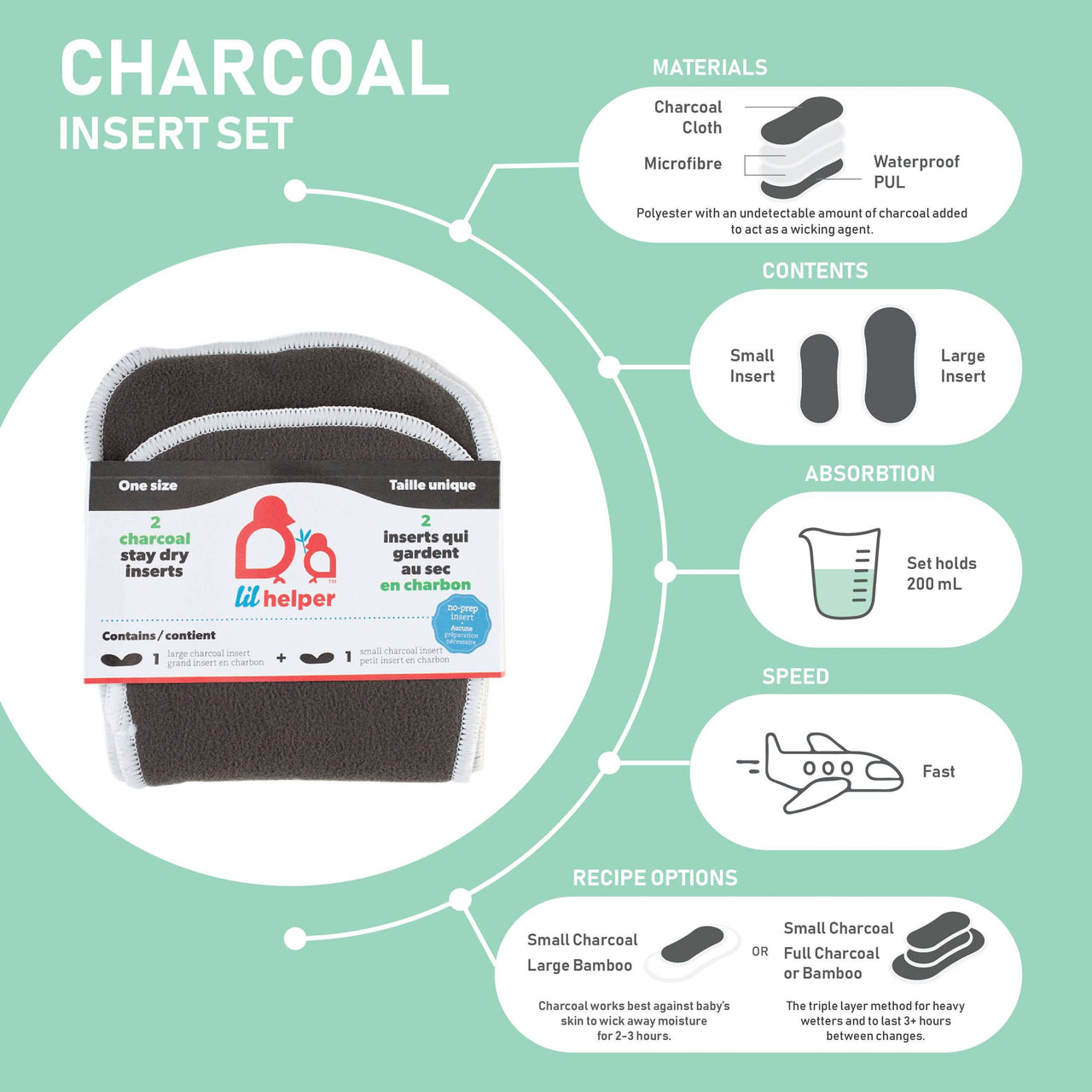 Our Charcoal Insert Sets are the original Lil Helper anti-diaper-rash solution. Each insert is made from a charcoal blend outer layer with two super-absorbent microfiber layers inside — all 100% polyester. This smart combo can hold up to 180 mL of liquid while keeping your little one feeling dry and comfy.