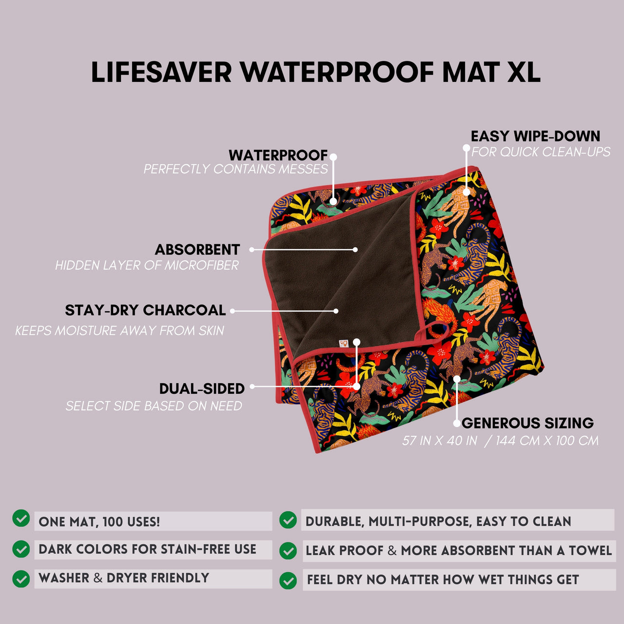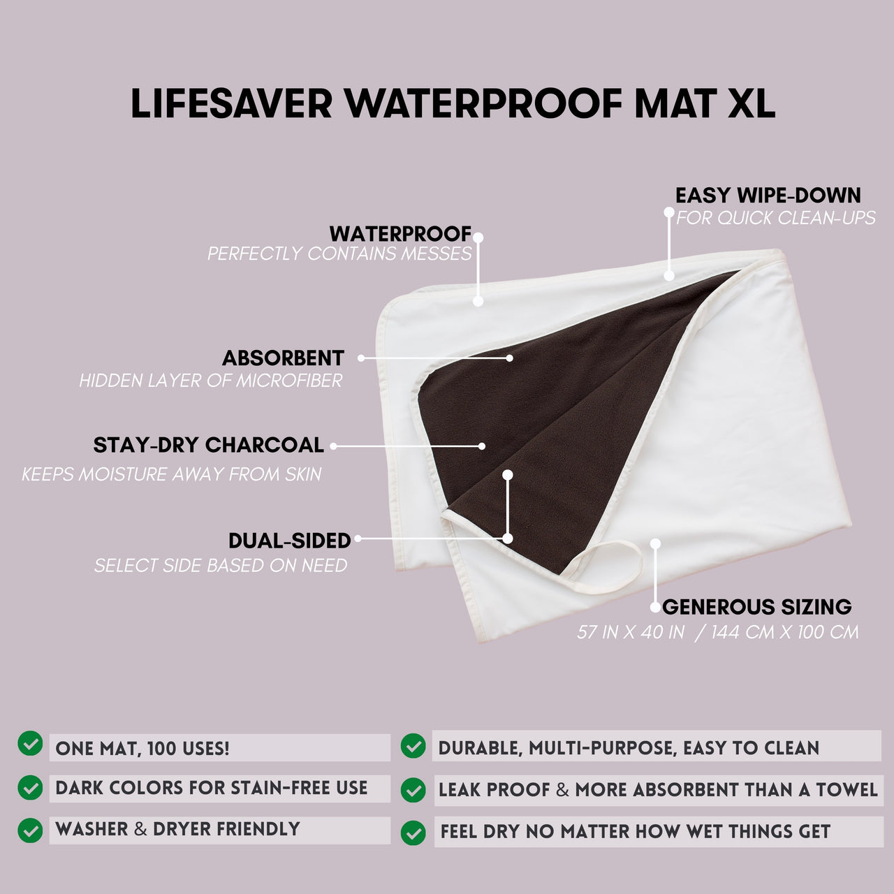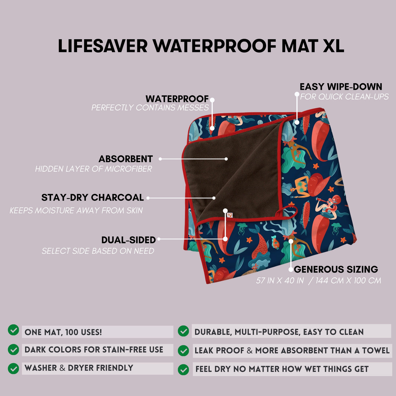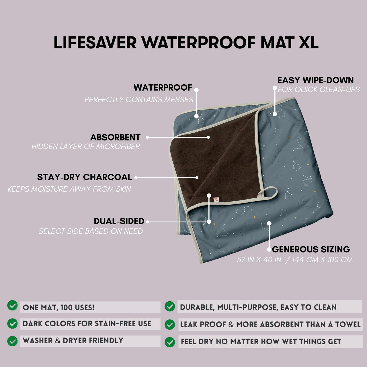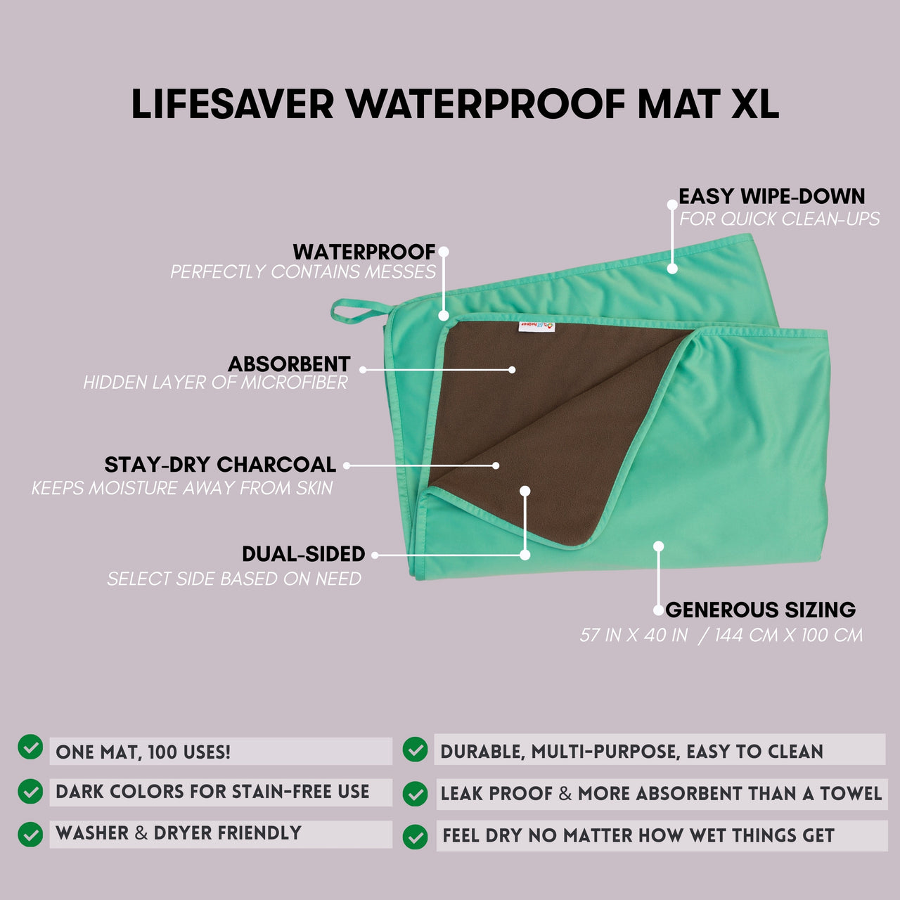• Lifesaver Mini: 18" x 28" (45.72 cm x 71.12 cm) – Perfect for cribs, changing stations, pet use, or on-the-go messes.