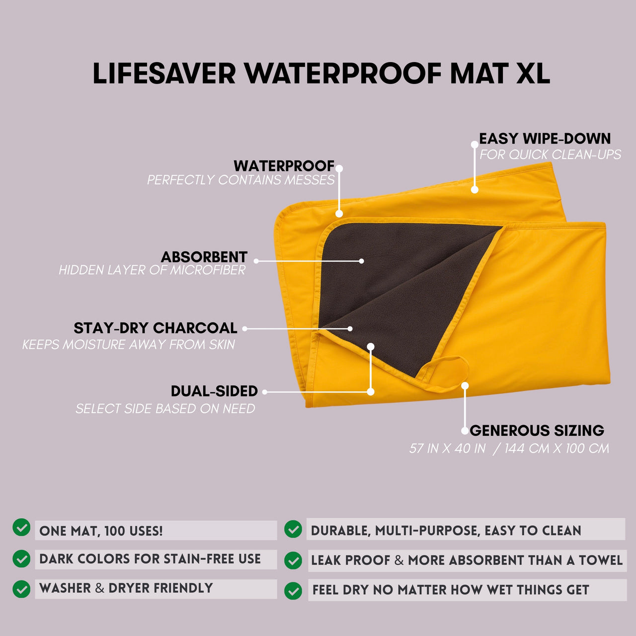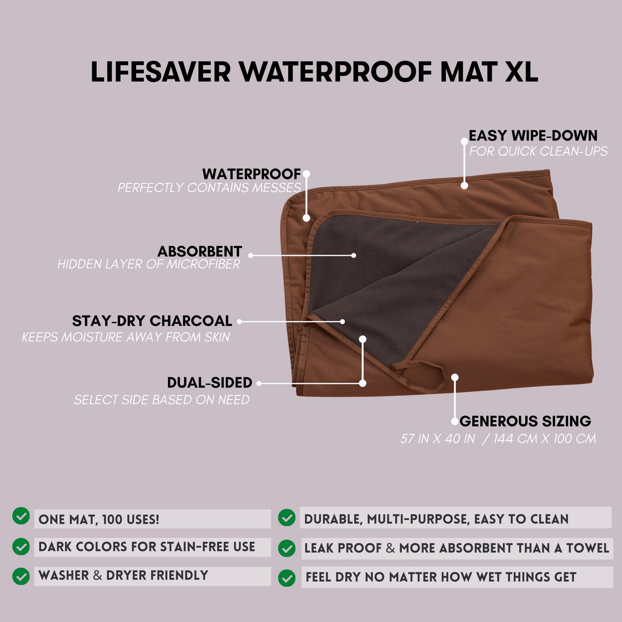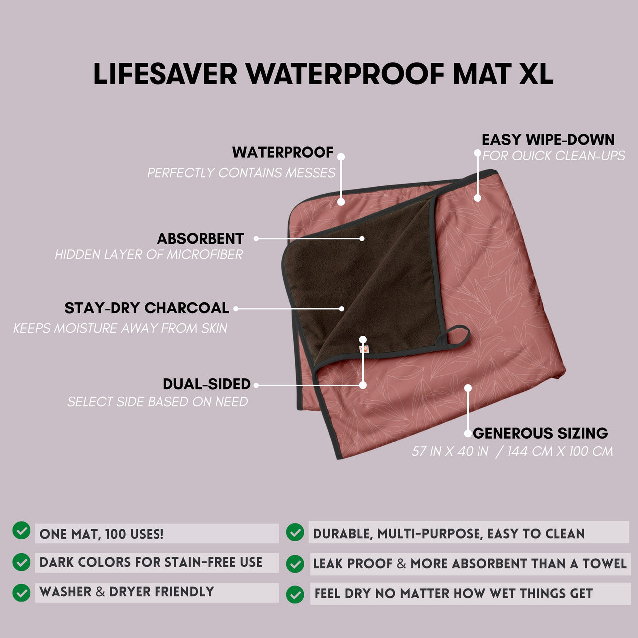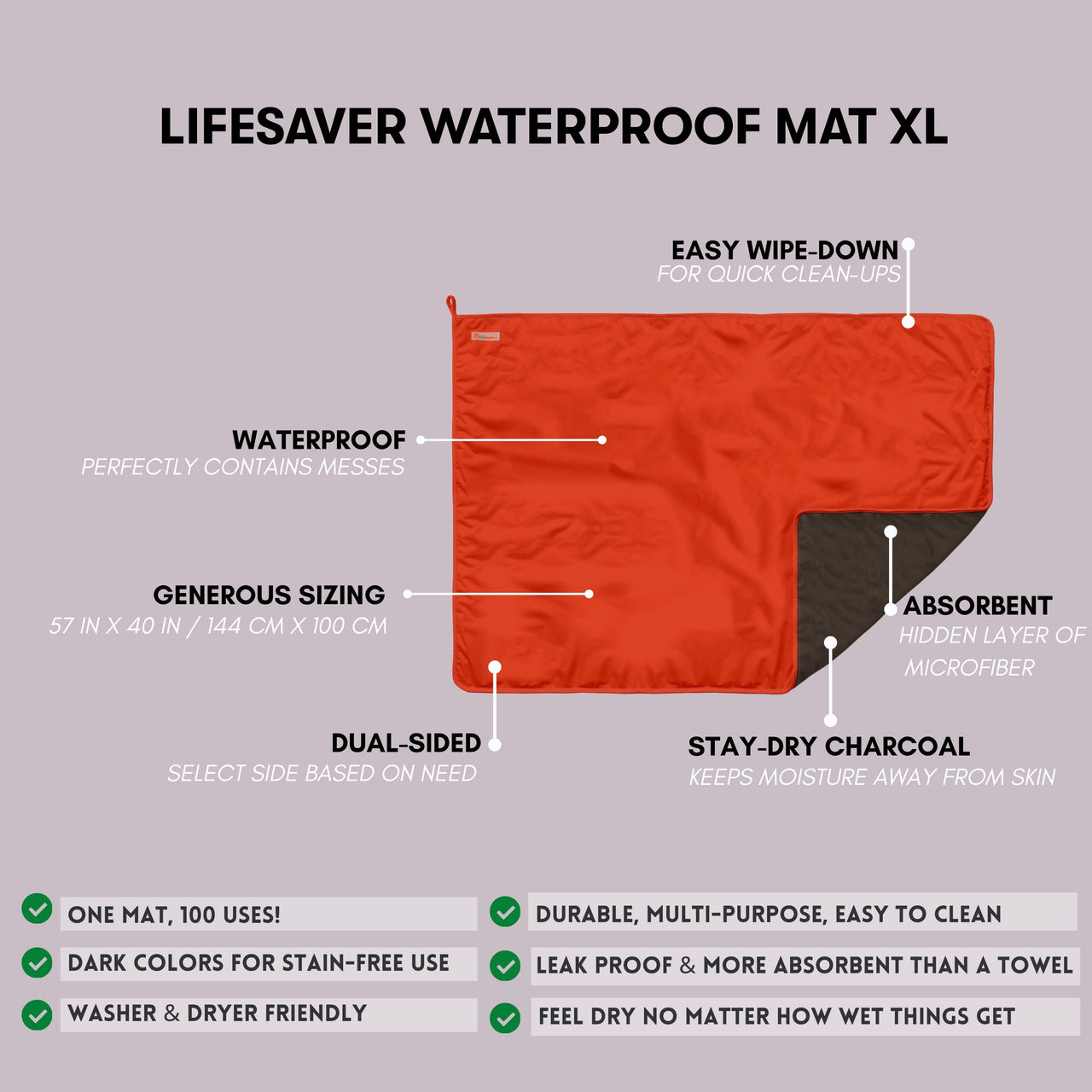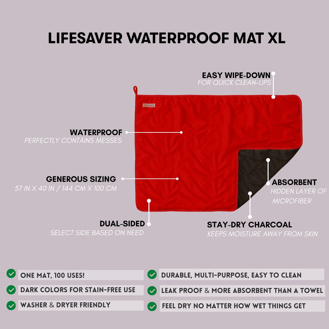 No matter the size, all Lifesaver Mats offer the same waterproof protection, cozy comfort, and easy cleanup.