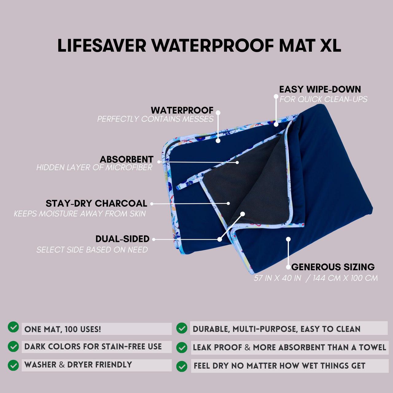 Whether you are experiencing big fun or big chaos, it is good to have big backup. Like our XL everything mat, the Lifesaver XL. With soft layers of absorption and a waterproof backing, our Lifesaver Mat is made for a messes of both the good and bad variety. And with it’s extra large size, the Lifesaver XL is ready for A LOT of whatever you are throwing at it.
