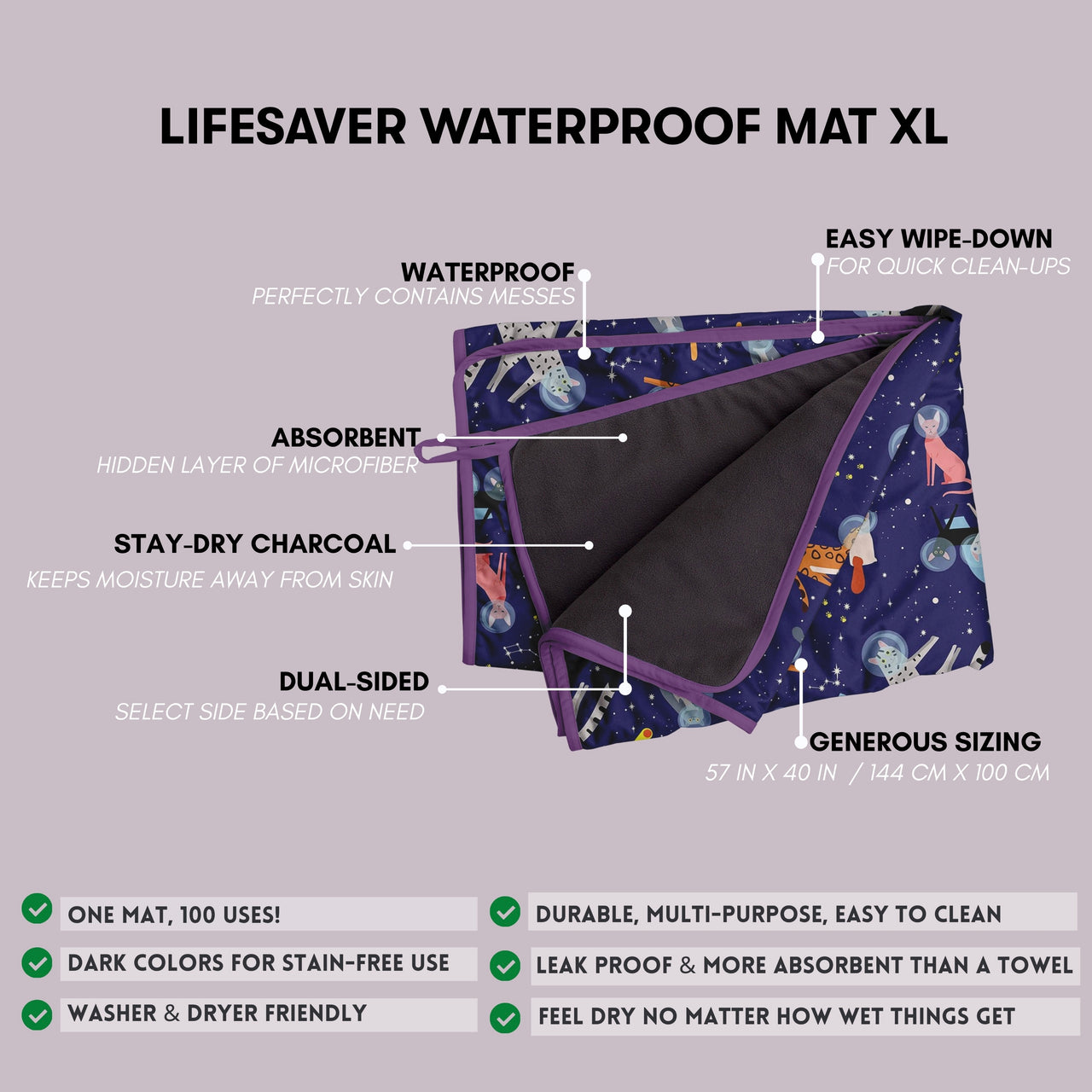 • Lifesaver XXL: 57" x 80" (144.78 cm x 203.2 cm) – Our largest mat, perfect for big messes, family snuggles, three-seater sofas, queen or king mattresses.